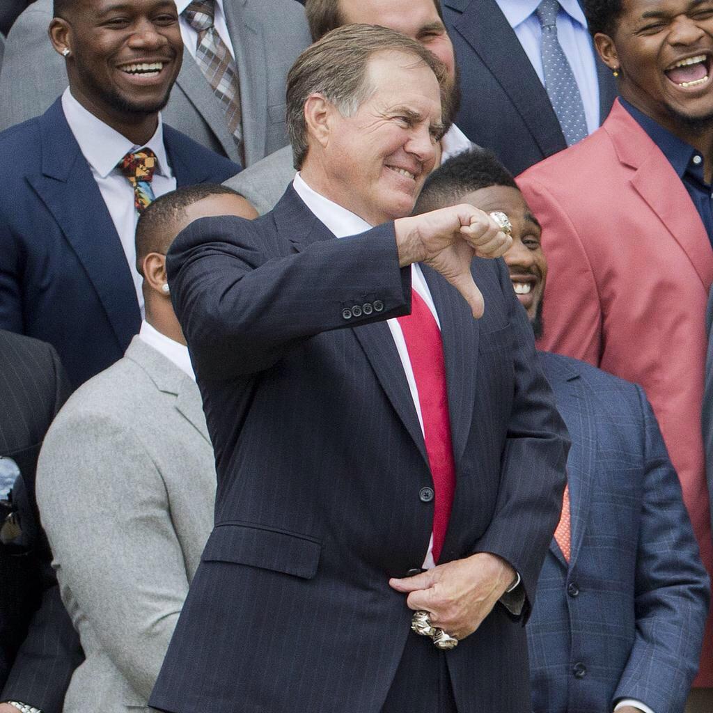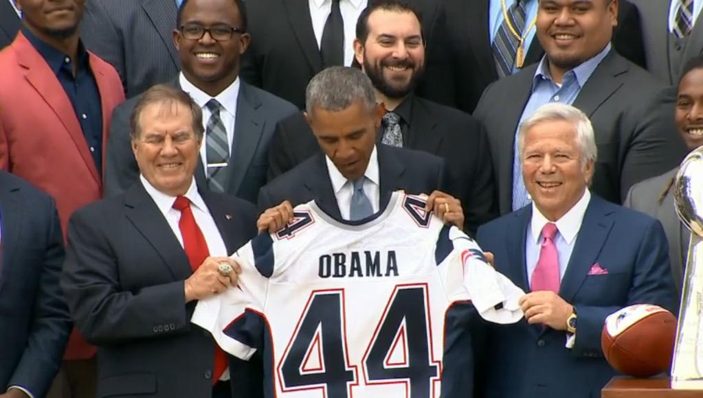 Robert Kraft presenteou o presidente com uma bola, camisa e capacete (assinado por todos os jogadores) dos Pats e disse que espera retornar a Casa Branca em 2016. Depois foi a vez de Bill Belichick, com um incomum sorriso e o dedo repleto de anéis, agradeceu aos fãs e encerrou a visita do time da Nova Inglaterra.